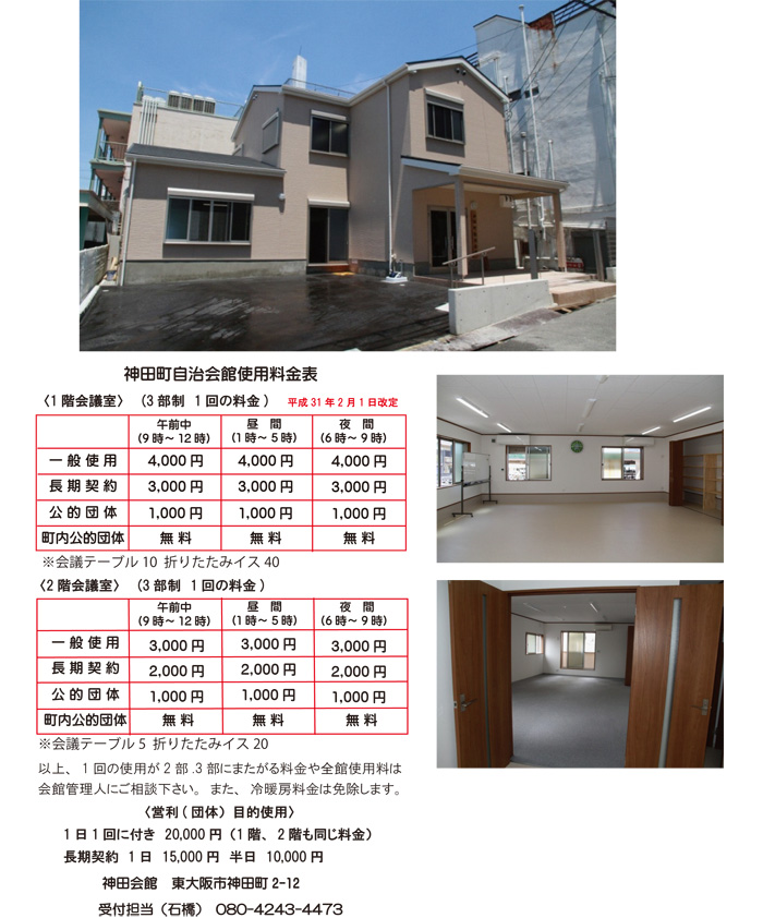 - 本館は四条地区自治会連絡協議会、神田町自治会館と称し、神田町の2番10号に位置する。以下本館を神田町自治会館又は神田会館と略称する。